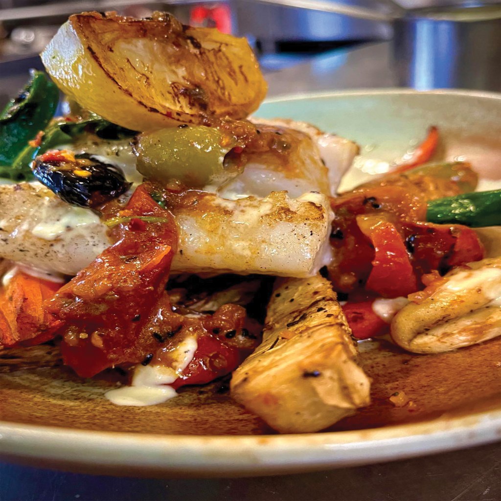 Saltfiskshnakkar bornir fram með kartöflum, sultuðum lauki, fennikku og ölifum