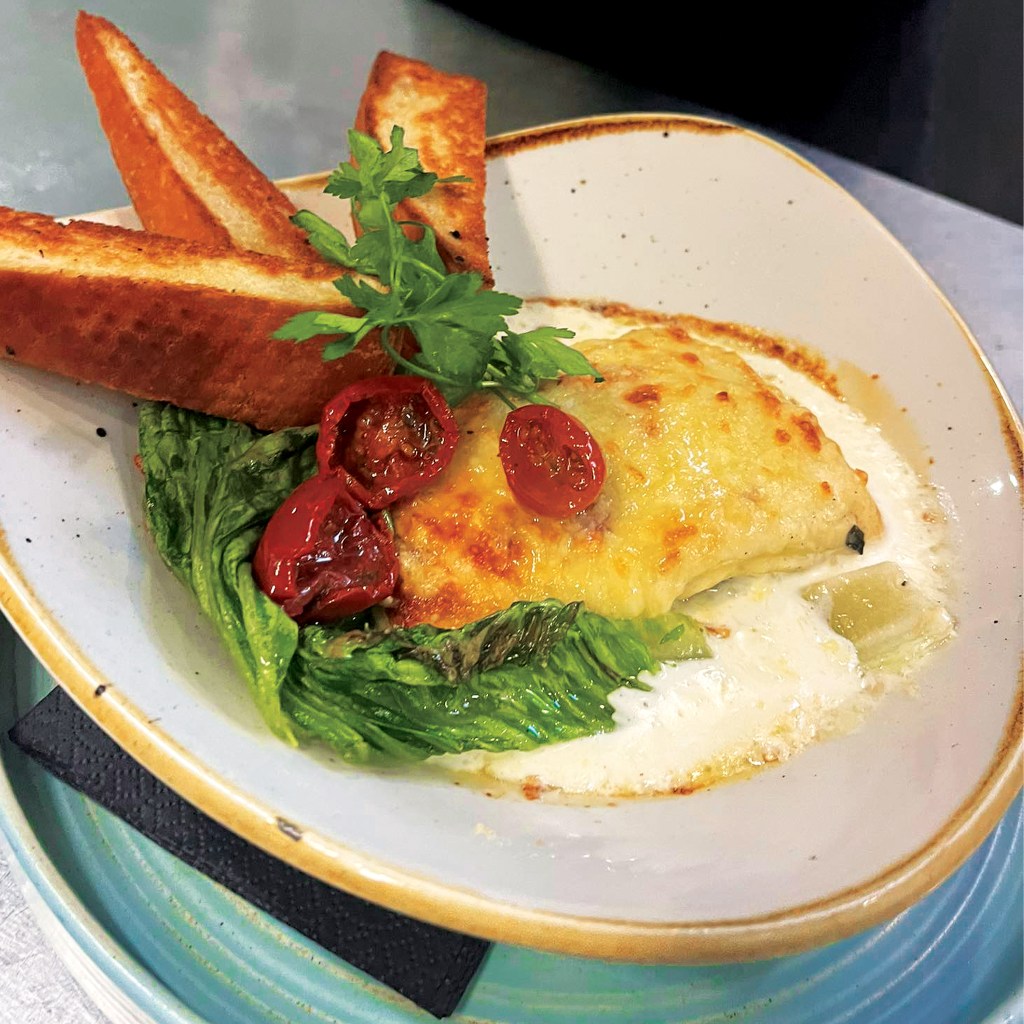 Feta cheese, cheddar, bechamel sauce and spinach. Served with garlic bread